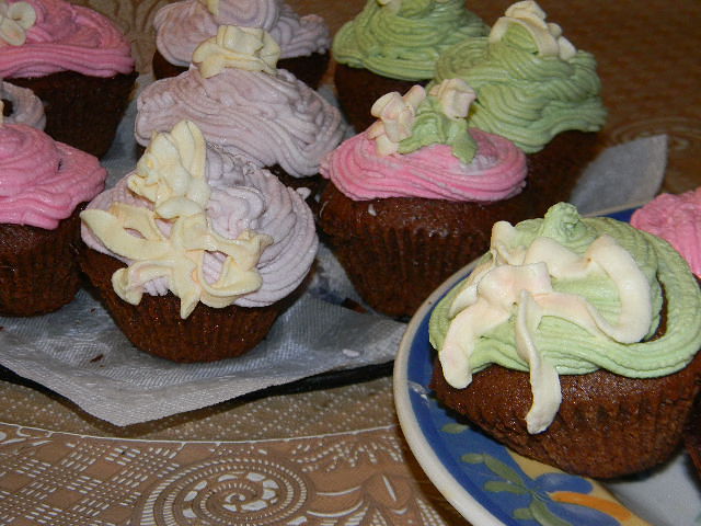 тесто: 150 г сливочного масла или маргарина 150 г сахара 100 мл молока 5 ст.л. какао 2 яйца 2 ч.л. разрыхлителя (или 1 ч.л. гашеной соды) 200-250 г муки крем: 5 ст.л. густой сметаны (не менее 20%) 4 ст.л. какао 4 ст.л. сахара 1 ст.л. сливочного масла Готовим тесто. В кастрюле смешать масло, какао, сахар, молоко. Довести до кипения, убрать с огня Остудить Добавить разрыхлитель и муку, замесить не очень густое тесто Формочки (любые, я использовала бумажные заказывалав И*кеи) немного смазать маслом, наполнить тестом на 2/3. Поставить в разогретую до 180 градусов духовку, выпекать в течение 20-25 минут Крем Готовим крем. В кастрюле смешать сметану, какао, сахар, масло. Довести до кипения (как только появятся первые пузырьки - убрать с огня). Остудить На остывшие кексы выложить остывший крем. При желании украсить кондитерской посыпкой или молотыми орехами Крем я меняю в этот раз делала со сливками
