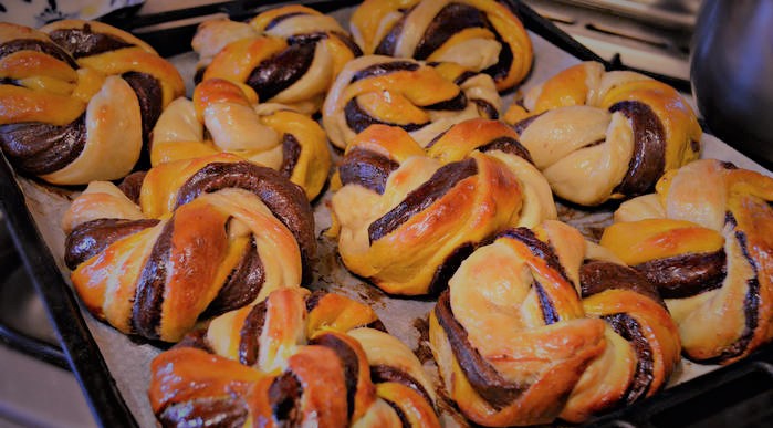 Тесто 1 — 80 мл кефира, — 1/3 ч.л. соли, — 1,5 ст.л. сахара, — 1/3 ч.л. разрыхлителя, — 4 ст.л. растопленного сл.масла — 4г сухих дрожжей — 1 яйцо - 2 стакана муки. Замесить тесто и хорошо вымесить. Тесто 2 — 80 мл кефира, — 1/3 ч.л. соли, — 1,5 ст.л. сахара, — 1/3 ч.л. разрыхлителя, — 4 ст.л. растопленного сл.масла, — 4г сухих дрожжей — 1 яйцо 2 стакана муки (без 2х столовых ложек) +2 ст.л. какао. Замесить тесто и хорошо вымесить. Тесто 3 — 100 мл тыквенного пюре, — 1/3 ч.л. соли, — 1,5 ст.л. сахара, — 1/3 ч.л. разрыхлителя, — 4 ст.л. растопленного сл.масла, — 4г сухих дрожжей, — 1 яйцо 2 стакана муки. Замесить тесто и хорошо вымесить. Для каждого вида теста все ингридиенты комнатой температуры. Какао и тыквенное пюре добавляем в конце. Сделать колобки и положить в холодильник на 12 часов. Я делаю с вечера, и на утро тесто отлично подходит. Вынуть из холодильника, дать немного согреться. Раскатать первый пласт, смазать раст. маслом и посыпать сахаром, вторым будет тесто с какао, тоже раскатать и посыпать сахаром, и верхний пласт с тыквой. Сложить все 3 пласта друг на друга. Разрезать на полоски, шириной с два пальца, роликом с фигурным ножом или просто ножом, скрутить тесто спиралью. Из скрученной полосочки сформовать булочку. Это же проделать и со всеми полосочками. Дать подойти минут 30, смазать взбитым яйцом и выпекать при температуре 180* 10 мин., а потом температуру повысить до 200 и печь до золотистого цвета После выпечки смазать сах.сиропом (4ч.л. сахара +2ч.л. воды) Даже спустя сутки булочки мягкие, ароматные и на ура съедаются с молоком)