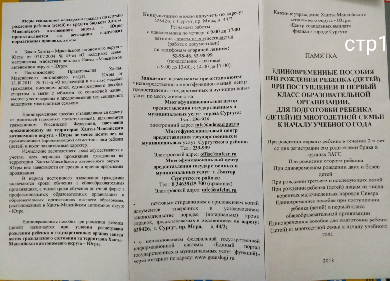 Единовременное пособие при рождении первого ребенка в течение двух лет со дня регистрации брака родителей. Полагается, если один из родителей проживал на территории Югры не менее 10 лет Развернуть/свернутьРазмер пособия -5000р