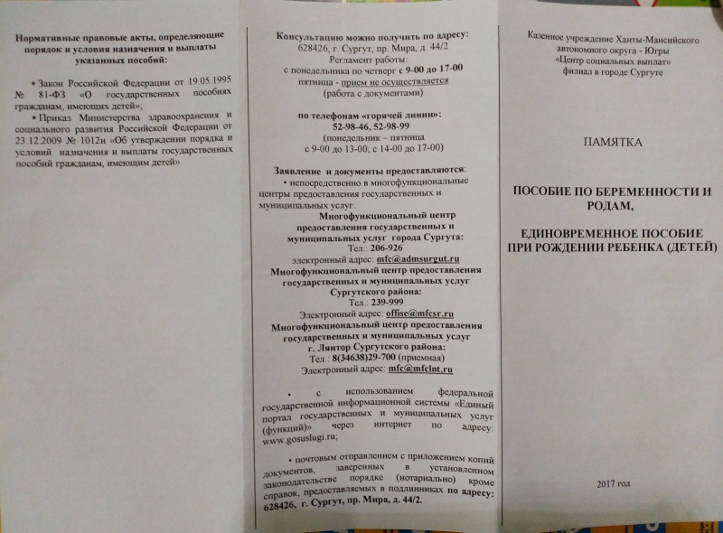 Все очень подробно о пособиях на сайте "Деткино" -> и Управления социальной защиты населения по г.Сургуту и Сургутскому району г.Сургут, пр. Мира, 44/2, (3 этаж) Телефон: 52-98-99, 52-98-46 http://uszn.surgut.ru/node/73 ФСС г.Сургут г.Сургут, ул. Ленина, д. 43 Телефон: (3462)36-32-54, 36-31-81 http://fss.ru/ru/consultation/index.shtml последнее редактирование февраль, 2018г |