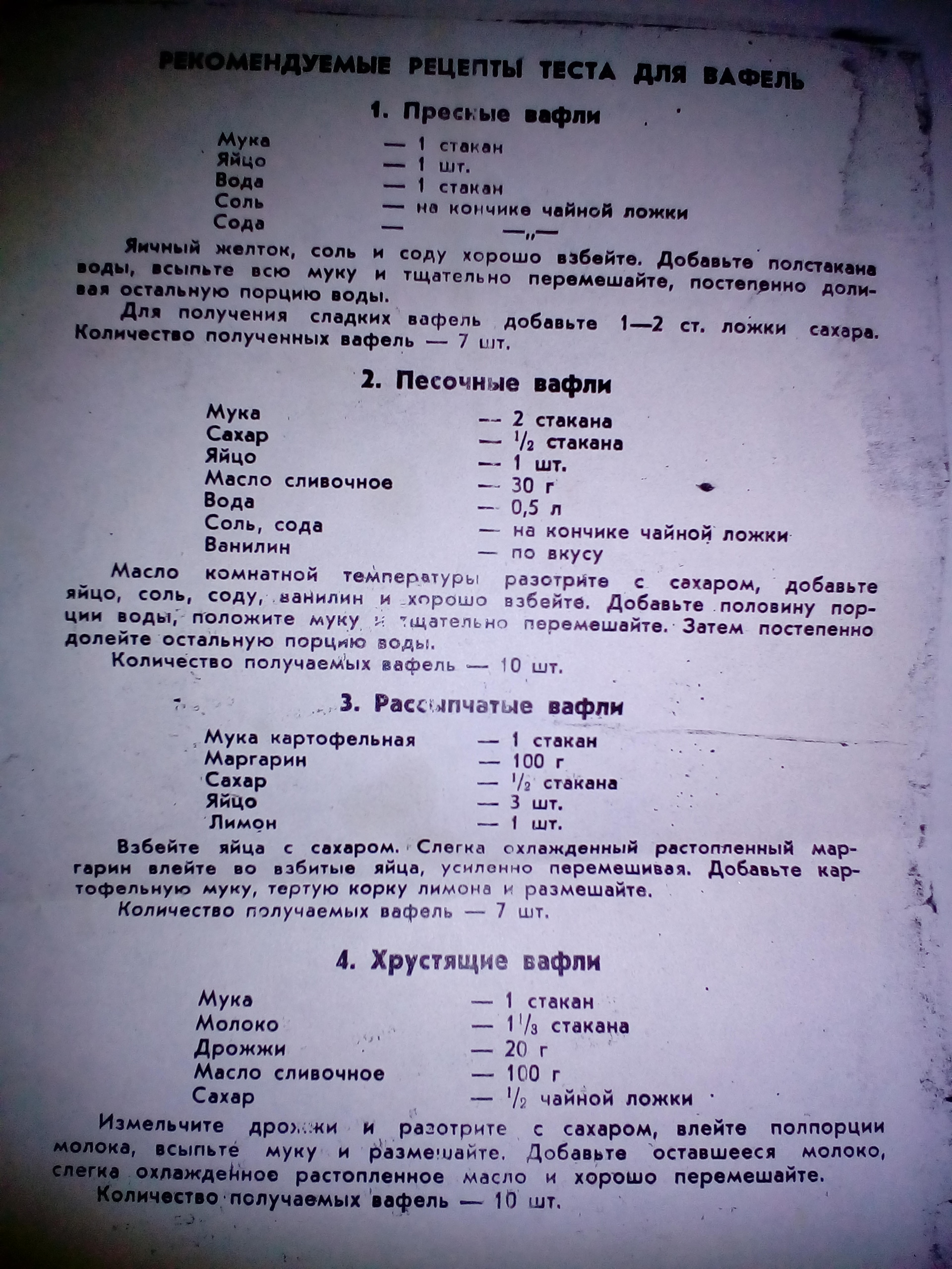 Loannakis писал(а): Девчат, а подскажите рецепт с молоком для вафель. Нашла у мамы вафельницу советскую. Попробовала рецепт где яйца и маргарин, но у меня вкус яиц все перебивает, как будто яичницу ешь) С молоком может понравится ![]() я пользуюсь преимущественно рецептом из распечатки ещё советской книжки "песочные вафли". Очень вкусные получаются! ![]() хотя в нём как раз яйца и слив.масло... без молока... может Вы не в той пропорции делали или по рецепту "рассыпчатые" ![]() Скину фото всех вариантов рецептов, которые есть у меня в книжечке - руководстве по эксплуатации советской электровафельницы (1987 года выпуска), может кому пригодится ![]()