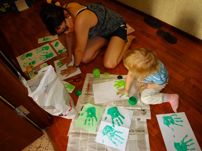 пальчиковыми красками рисовали, вместо кистей использовали губку, ну и пальчики, ладошки и даже ножки ![]() |