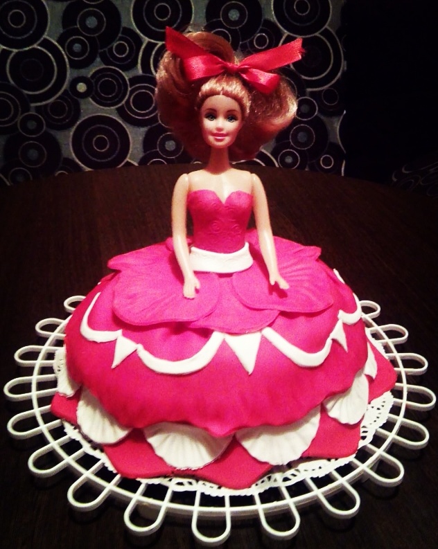 Цвет на самом деле красный с белым у мастики. У куклы в этот раз ноги убрала, так как торт небольшой получился. Внутри торт "Милка". Как на вкус еще не знаю. Вечером попробуем.
