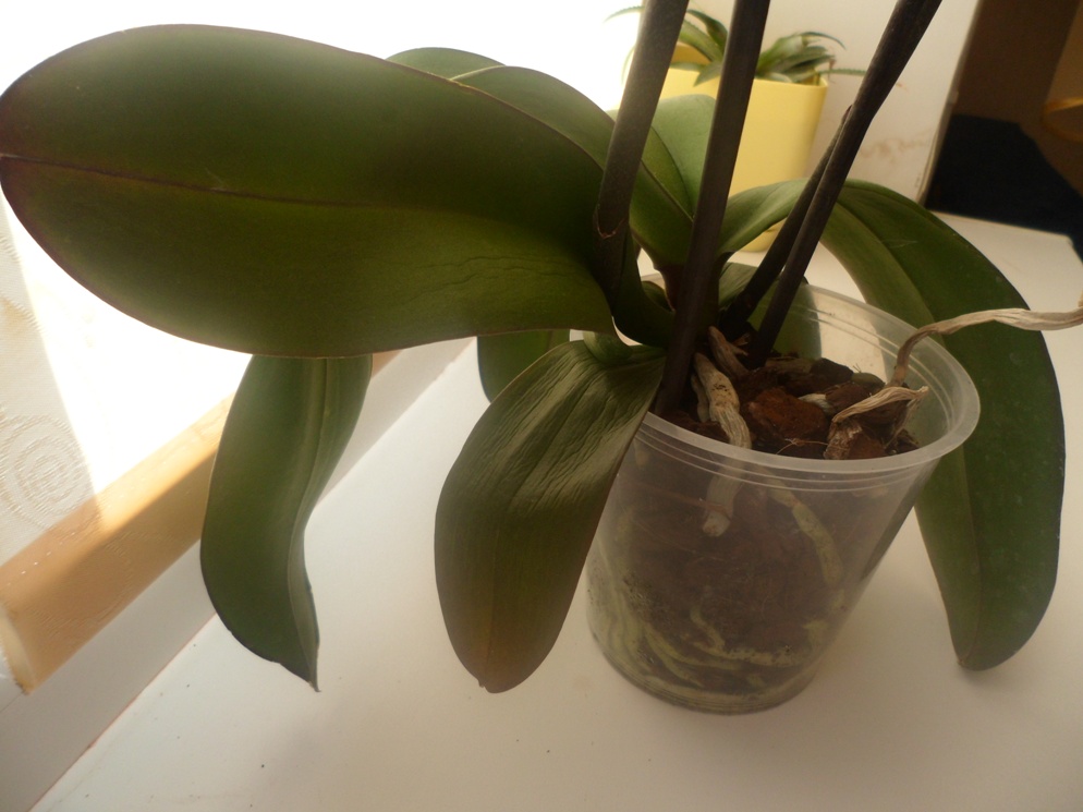 Подскажите пожалуйста, у моей новенькой орхидеи листь стали как-то скручиваться, подсыхать. Отчего это - от недолива? просто побаивалась перелить и еще вопрос - как увлажнять корни, которые торчат над грунтом?