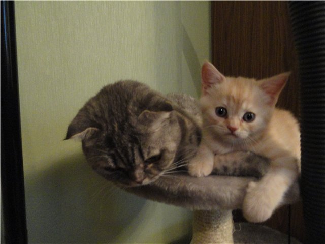 первый помет. Есть одна скоттиш-страйт рыжая. Голубая и пестрая тоже девки. А кот один - кремовый.