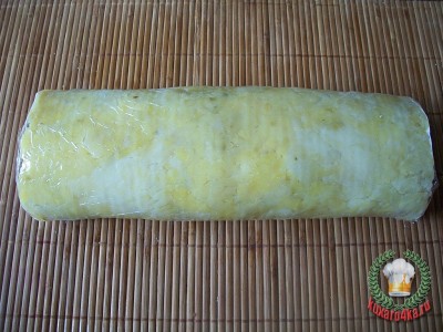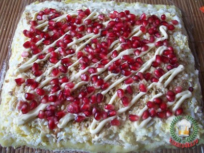 Состав: Картофель — 5-6 шт Яйца — 3 шт+5 шт для украшения Куриное филе — 1 шт Лук — 1 шт Орехи грецкие — 1/2 ст(чищенные) Гранат — по вкусу Майонез Уксус Соль Для украшения: Укроп Морковь — 1 шт Свекла — 1 шт Редис Лук-порей Примечание: Украсить хлопушку Вы можете по своему желанию из любых овощей и продуктов. Приготовление: На пищевую пленку толщиной в 1 см выложить, отваренный в мундире, картофель и потертый на терке, в виде прямоугольника. Хорошо утрамбовать, посолить и смазать майонезом. Сверху,отступая от одного края выложить порезанное на мелкие кусочки отварное куриное филе и полить майонезом. Затем слой замаринованного в уксусе мелко порезанного лука. Следующий слой — потертые на мелкой терке яйца и смазать майонезом. Потом измельченные орехи и смазать майонезом. Сверху зерна граната. Аккуратно свернуть в рулет и завернуть в один слой пищевой пленки. Поставить в холодильник. Достать, освободить от пленки, уложить швом вниз на блюдо и смазать со всех сторон майонезом. Оставшиеся яйца разделить белки от желтков. Белки потереть на терке и половину залить соком свеклы для окрашивания в розовый цвет. Дать постоять минут 15 и отбросить на сито, чтобы стекла жидкость. Другой половиной белков присыпать бока хлопушки. Окрашенным белком с обоих сторон хлопушки выложить полоски наискось. Затем присыпать мелко порезанной зеленью в виде двух полосок. Затем 2 полоски потертого на терке желтка. Следующие полоски порезанного на мелкие кубики листья лука-порея. И по середине окрашенный потертый белок. С яиц, зерен граната и любых овощей, например редиса, моркови, огурца и т.д. вырезать кружочки или треугольнички и украсить салат в виде рассыпанного конфетти.