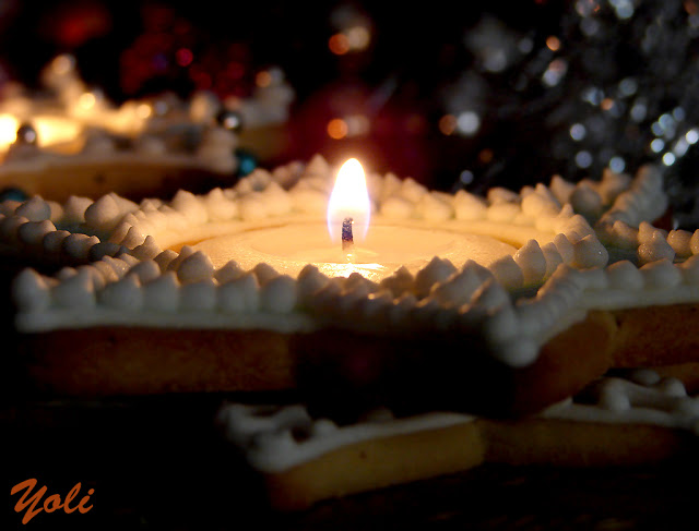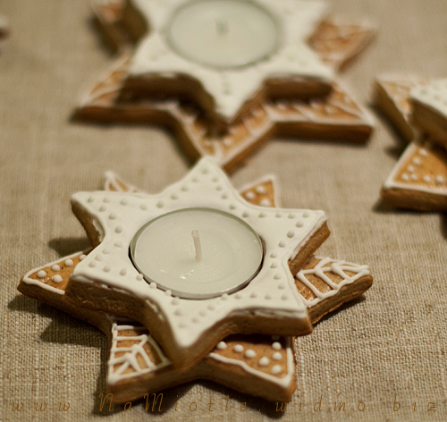 Креативно и в то же время очень празднично и по-домашнему уютно. Случайно расположенные между вкусной едой на праздничном столе они обеспечат комфорт и тепло вашего дома. Делаем пряники, а за одно и пряничные подсвечники. Они могут быть в форме звезд, снежинок или любой другой формы. Важно, чтобы на каждую свечку, таких пряничков было по 2 экземпляра. Делаем тесто, по обыкновенному рецепту. Затем по предварительно сделанной заготовке, вырезаем нужную нам форму. Кружок в центре можно сделать с помощью круглой основы металлического подсвечника: Выпекаем наши пряники также по-рецепту, а после выпечки, украшаем глазурью и сахарными серебряными бусинками. Наслаждаемся теплом, уютом и вкусными пряниками. ![]()