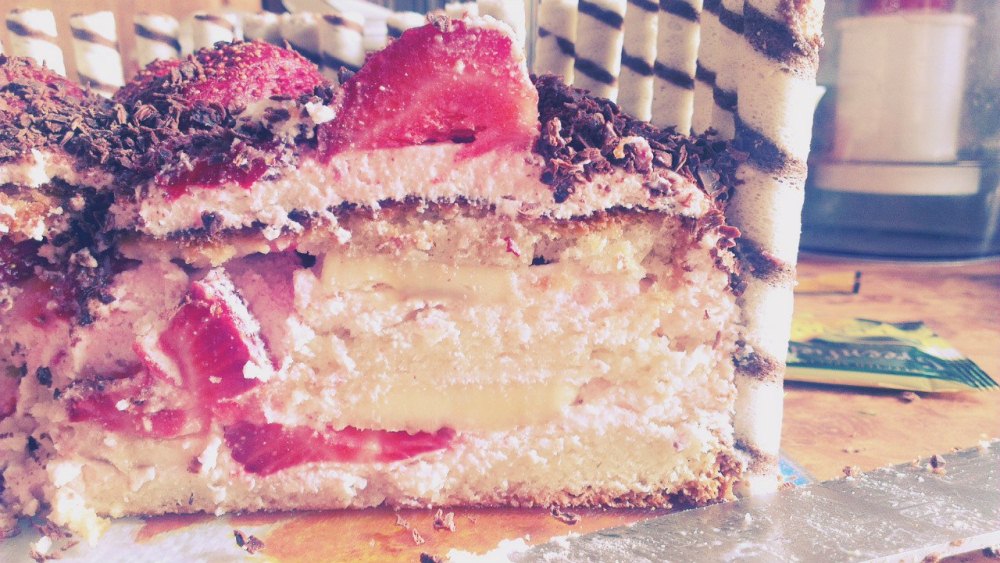 готовится достаточно быстро. Вместо клубники зимой делаю еще с киви.Тогда торт не очень сладкий и с приятной кислинкой. Плюс, если брать консервированную клубнику, то сок растекается и получается не очень красивое желе сверху(не прозрачное), но это никак не влияет на вкусовые качества!:) Еще в тесто под настроение добавляю какао...тогда коржи получаются шоколадные!:) |