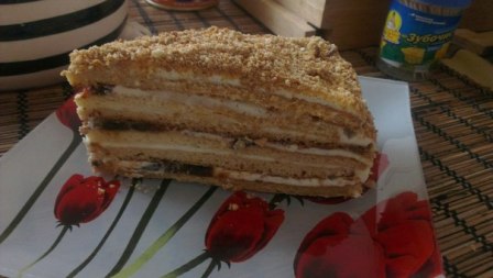 Берем: 2ст. ложки меда 4 стакана пшеничной муки 1 ст сахара 3 шт. куриного яйца 60-70 гр. сливочного масла 1,5-2 ч.ложки соды гашенные в уксусе или 1 пачка (10 гр) разрыхлителя чернослив Крем: 500-600 гр сметаны не ниже 25% жирности 1 ст.сахара Ставим на огонь небольшую кастрюльку с водой, на кастрюльку ставим миску. Доводим воду до кипения и начинаем наше действо Кладем в миску масло, растапливаем его, добавляем сахар и мед. Помешиваем, пока сахар не растворится. Добавляем соду(гашеную в уксусе), и помешиваем пока масса не увеличится в несколько раз. Снимаем миску и даем немного остыть. Взбиваем яйца и добавляем к нашей массе, перемешиваем и добавляем муку. Тесто должно быть тягучим. Делим на 6 частей и раскатываем на ,хорошо присыпанной мукой, поверхности. Раскатали, Положили тарелку - обвели и на противень, присыпанным мукой. И в разогретую до 180-200 гр. духовку. Несколько обрезков также выпечь. Дать коржам остыть. Обрезки размалываем в крошку. Крем. Сметану взбиваем с сахаром, чернослив моем и нарезаем. Предварительно чернослив замочить в кипятке. Все. Складываем. корж, сметана чернослив корж, сметана и так чередуем. Сверху обмазываем сметаной и посыпаем крошками. И в холодильник. Вложение: Вложение: