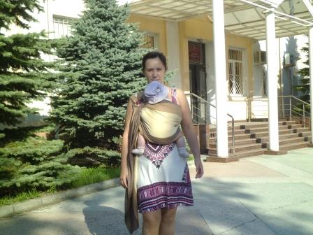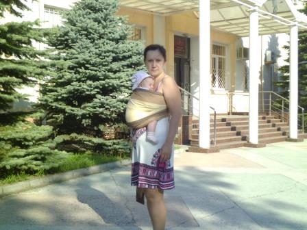 И малышка уже гораздо правильнее сидит. А Вы пробовали грудь ей давать в слинге? Обычно с грудью детки намного дольше могут пробыть в слинге.