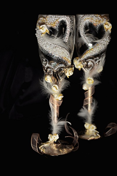 А мне нравится оформлять бокалы. Украшения наклеивались на бокалы термопистолетом и моментом (кристалл). Вот только кружева пришивались ниткой с иголкой, а блёстки клеились на обычный лак для ногтей. Вот что из этого получилось: