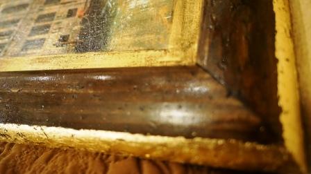 . И вот что получилось, правда абсолютный "свежак", еще и высохнуть толком не успело..зато вышеописанный "эффект древесного жука" попробовала . Уж очень я тяготею к классике , поэтому и работы у меня все в этой теме.Использовала рисовую бумагу, простую рамку из натур. дерева, золотую поталь, кракелюр, сусальное золото, золотую затирку для кракелюра, краску для дер. рамы покупала в строительном магазине ( там и воск и лак и т.д.), коричневая умбра для затирки, картинка приклеена на холст для акварели.