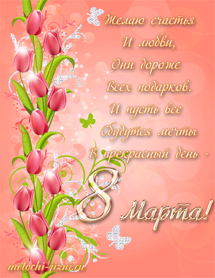 Мужских носков под креслом нет Блестят тарелки аметистом, Готов торжественный обед. Исчезла тара из под пива, Пейзаж окурков не цветет, А на столе под пенкой сливок: Горячий кофе в чашке ждет. Цветов весенние букеты Благоухают неспроста В коробке – вкусные конфеты, И чисто вымыта плита. Ох, как бы не схватить инфаркта Сегодня, в день 8-го Марта.. С 8 МАРТА девчонки ![]() ![]() ![]() ![]() |
