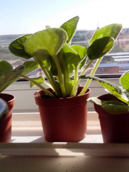 Наташа посмотрите пожалуйста.Сфотала одну.Но они все такие,копии друг друга.Семь штук.Та что потемнее-только из середины лезут листики.Мешают друг другу,получаются ,,уродцы.Не розеткой растут,а как бы в середке друг на дружке вверх.Приходится переодически лишнее из середки убирать.А тот что посветлее растет плотно,листиков много.Но они почему-то на очень длинном черешке,как буд-то им света не хватает.Рядом стоит молоденькая глоксиния,недавно вылезла из картошки.И уже видно будущие бутоны.А фиалочки не хотят цвести.Может какие-нибудь дегенеративные,как бывают китайские розы цветущие раз в жизни?Могу ли я надеятся,что хотя бы в конце лета я увижу цветы?