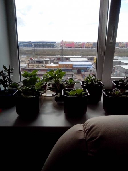 Хочу еще совета попросить на счет своих фиалок.Некоторые покупала цветущими в магазине.Одну взяла в СП.Какие-то мама подарила тоже цветущими.За пару-тройку лет тех цветов не стало ,а остались их ,,детки,,.Пересаживала,выращивала из листочков.И в одно время(вечером) поливаю отстоянной водой и удобрения(агрокол) добавляю.У меня окно очень солнечное,жаркое.Но т.к. фиалки любят свет,не убираю с подоконника,а притеняю....Ну чуть ли не с бубном и маракасами над ними не бегаю.Не хотят цвести....За год ни один ни одного цветочка.....У мамы все фиалки цветут...Только у ней нет в квартире яркого солнца.Но я тоже притеняю ....Ни чего понять не могу.Со спатифиллумом таже история была,пока не убрала с окна на полку.Опять же фикус поставила в угол и он вырос аж до 1 метра с копейками.Может ему макушку прищипнуть что бы уже в высоту не рос?Общем цветов навалом,а цветущих нет,как сговорились..Одна целеная масса.Что не так ,подскажите.Фото фиалок для наглядности.В маленьких тесных горшках.Не далеко от света.В солнцепек притеняю.