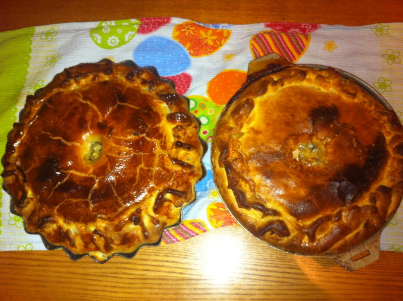 Песочное тесто и начинки: курица отварная с жареным луком, грибы жареные с луком, рис+вареное яйцо опять с жареным луком. Слой начинки-блин-начинка-блин и тд. Закрываем пирог тестом и делаем дырку для выхода пара. |