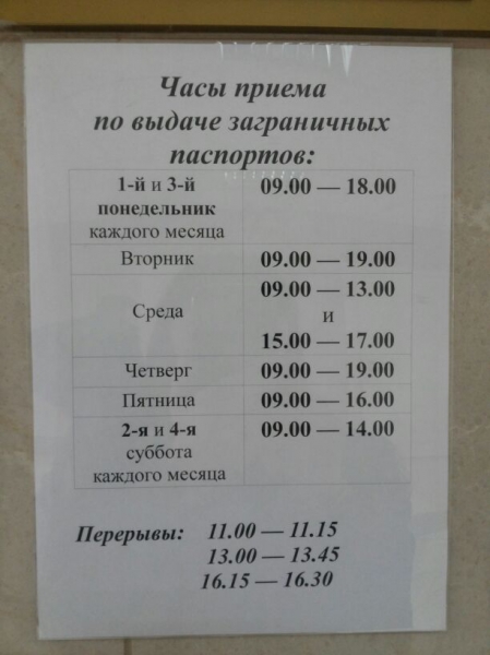 (понедельник - пятница, с 9.00 до 17.00, перерыв с 12.30 до 14.00) Узнать о готовности загранпаспортов можно по телефону (3462) 76-18-86 На получение готового загранпаспорта теперь тоже можно записаться по телефону (3462) 76-18-87 с 9.00 до 11.00 Через портал государственных услуг http://www.gosuslugi.ru: Развернуть/свернуть1. оформляются заграничные паспорта граждан РФ, содержащие электронные носители информации