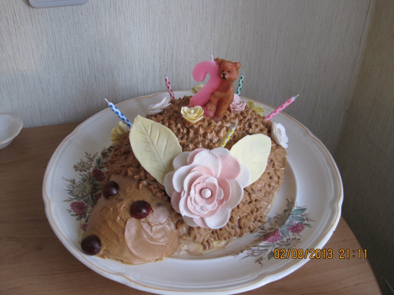 Прикольный такой ёжик! Я и не думала, что из сгущенко-масляного крема такие иголочки классные получаются. Прям съесть захотелось.
