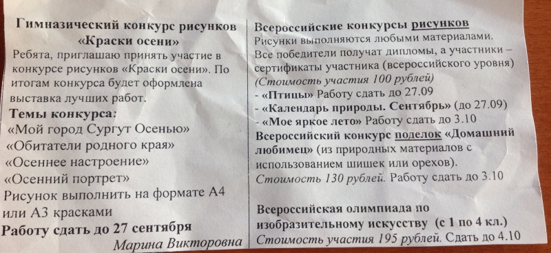 У нас "Б" класс. Меня учительница предупредила об олимпиаде и в дневнике сынуля написал "принести олимпиаду". правда качество копий не очень, спасибоМурлакатоша, сбросила цветной вариант на почту. А еще у нас есть электронная почта для всего класса, где каждый день классная рук. пишет какие задания выполнить по всем предметам и любые объявления для родителей. |