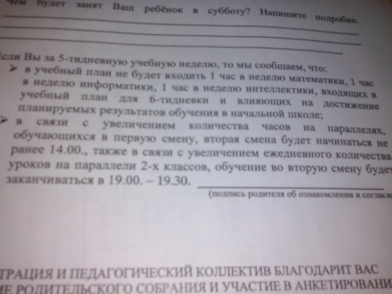Это,простите, не анкета. У нас было примерно так:посещает ли ребенок спорт.секции? Сколько времени тратится на выполнение дом.задания? Зачем вам 5 дневная учебная неделя? Согласны ли Вы,чтобы допы были вынесены на субботу на свободное посещение и все в том же духе. Все анонимно,ди те принесло домой,вместе почитали,ответили, и отнеслиси обратно в школу.Класс 100 % за пятидневку.  |