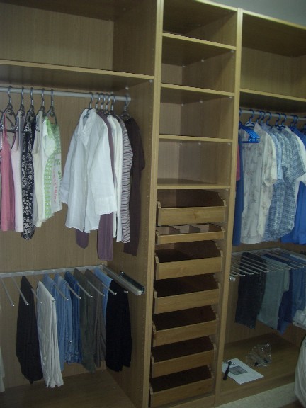 Какие хоть они бывают? У меня получается вдоль двух стенок можно поставить шкафы примерно по 3м длиной. Ещё туда-же мне надо вместить стиральную машинку и морозильную камеру. Как-то заходила в отдельчик где гардеробные делают (в Богатыре на 3 этаже). Очень мне показалось дорогое наполнение гардеробных. 1 железная корзина - 800р. Я уже думаю может потихоньку наполнение заказывать в Икее в закупке, а тут потом только шкафы заказать... Но для этого надо её сначала спланировать. Расскажите девочки про свои гардеробные - что удобно, что нет: деревянные выдвижные ящики, железные корзины, полки, ещё есть держалки для брюк и полки для обуви - наклонные такие с дырочками - это то, что я в Икее присматриваю. Вот картинки с инета на которые я пока ориентируюсь