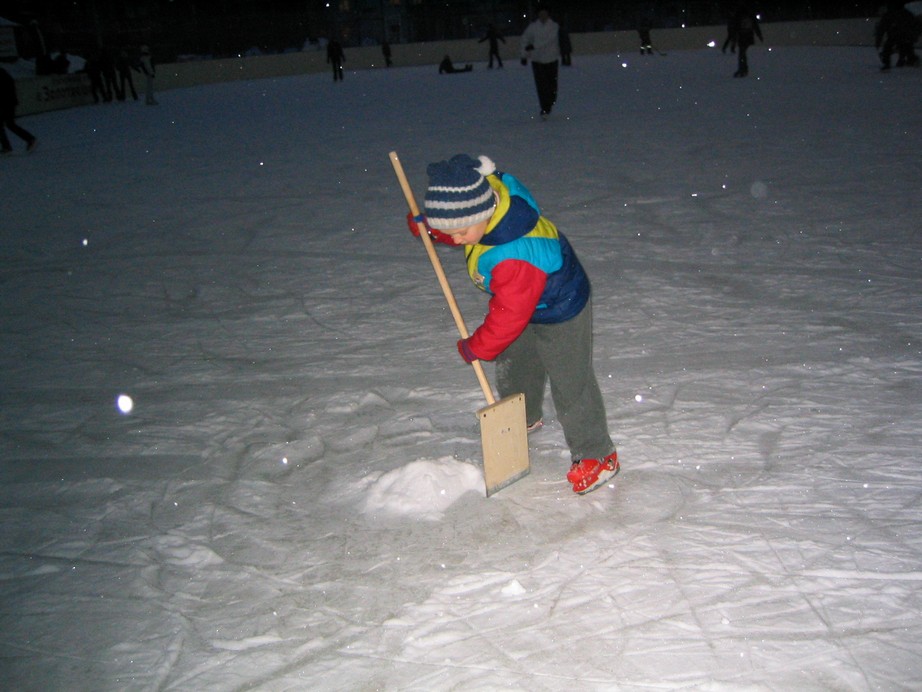 Мы на выходных ходили на каток.Сынуля,увидев нас коньках,ну очень жалостно просил одеть ему тоже...нашли самые маленькие и решили попробовать.На льду конечно ему совсем трудно,а по снегу возле катка уже через 10 минут он вполне сностно ходил за руку....