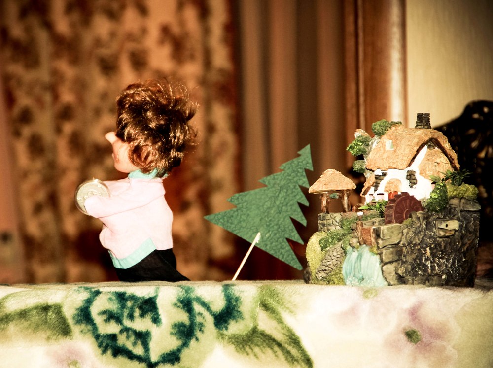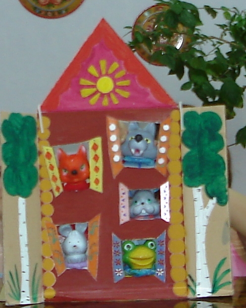 Для теремка сделали картонный домик, окошки точно подходят под головы героев. Вложение: Красную шапочку мы показываем под фонограмму. Скачали аудио-сказку, и просто водим фигурками. По-моему хорошее решение, даже для тех у кого нет актерского таланта :)